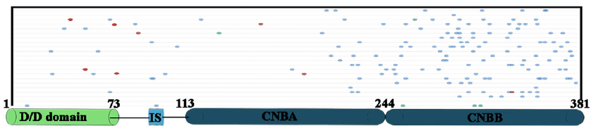 PRKAR1B is the gene that encodes the PKA-R1β protein (sometimes just denoted PRKAR1B). PKA-R1β is composed of a chain of 381 amino acids. Mutations of individual amino acids in this chain can alter how the PKA protein complex functions, and in some cases lead to pathological conditions. Not all mutations in PRKAR1B/PKA-R1β cause MASNS, and some specific mutations are associated with pathologies that are distinct from MASNS. Most MASNS-associated mutations are in the cAMP-binding domains of PKA-R1β (CNBA and CNBB), especially CNBB (see figure above). Of the many PRKAR1B mutations associated with MASNS, the R335W mutation has by far the highest frequency in the patient population.